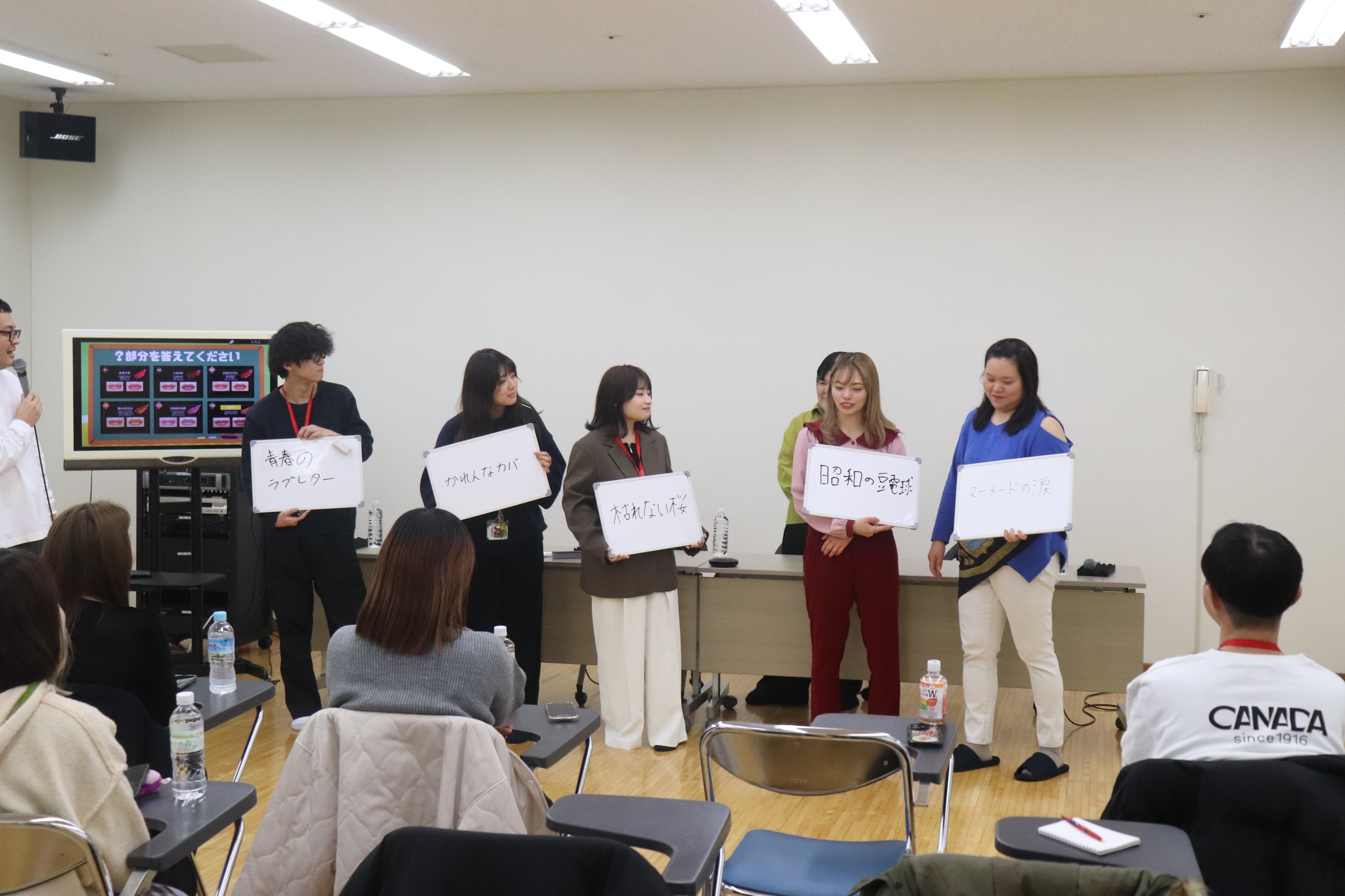 化粧品の商品名を当てるクイズでは、「青春のラブレター」「昭和の豆電球」「マーメイドの涙」などが回答として出され、